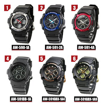【1】 AW-590-1A 【2】 AW-591-2A 【3】 AW-591-4A 【4】 AW-591BB-1A 【5】 AW-591GBX-1A4 【6】 AW-591GBX-1A9駆動方式クオーツ素材:ケース【1-3】 ウレタン【4-6】 樹脂/アルミ素材:ベルト樹脂風防無機ガラスサイズ(縦×横×厚)約52×46.4×14.9mm重さ約49.8-58g仕様・耐衝撃構造(ショックレジスト)・20気圧防水・ワールドタイム:世界27都市(29タイムゾーン、サマータイム設定機能付き)+ GMT(グリニッジ標準時)の時刻表示・ストップウオッチ(1/100秒、60分計、スプリット付き)・タイマー(セット単位:1分、最大セット:60分、1秒単位で計測、オートリピート、タイムアップ予告機能付き)・時刻アラーム5本(1本のみスヌーズ機能付き)・時報・フルオートカレンダー・12/24時間制表示切替・LEDライト(オートライト機能、残照機能、残照時間切替(1.5秒/3秒)付き)・精度:平均月差±15秒付属品取扱説明書(英字)G-SHOCKオリジナルボックス保証当店にて一年保証CASIO G-SHOCK の商品一覧はこちら♪